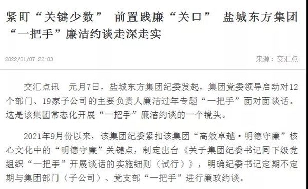 1月7日,“交匯點”新聞客戶端關(guān)注鹽城東方集團黨風(fēng)廉政建設(shè)相關(guān)工作做法。